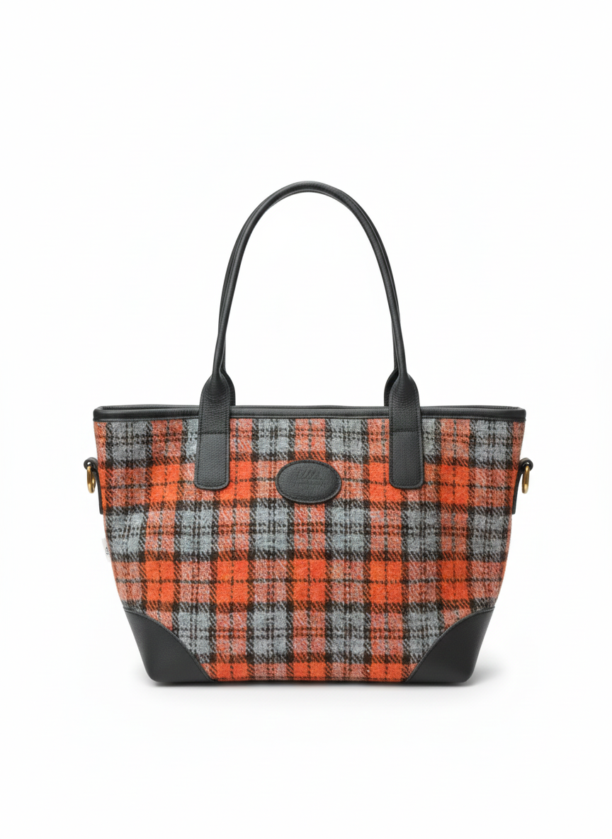 This orange checked Harris Tweed is our signature thick cloth, in one of our very best multi-colour options giving the bag structure, warmth and a classic look that works with jeans or a smart coat.